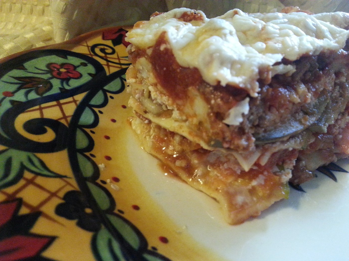 So here it is today! Lasagna. The way I made this recipe counted up to 7 points per serving (10 servings in a pan) and it’s SO worth it! I used my mom’s traditional recipe and amped it up with a bunch of veggies. This makes it go further, fill you faster and gives you alot of extra healthiness! 🙂 And did I mention yummy?!?