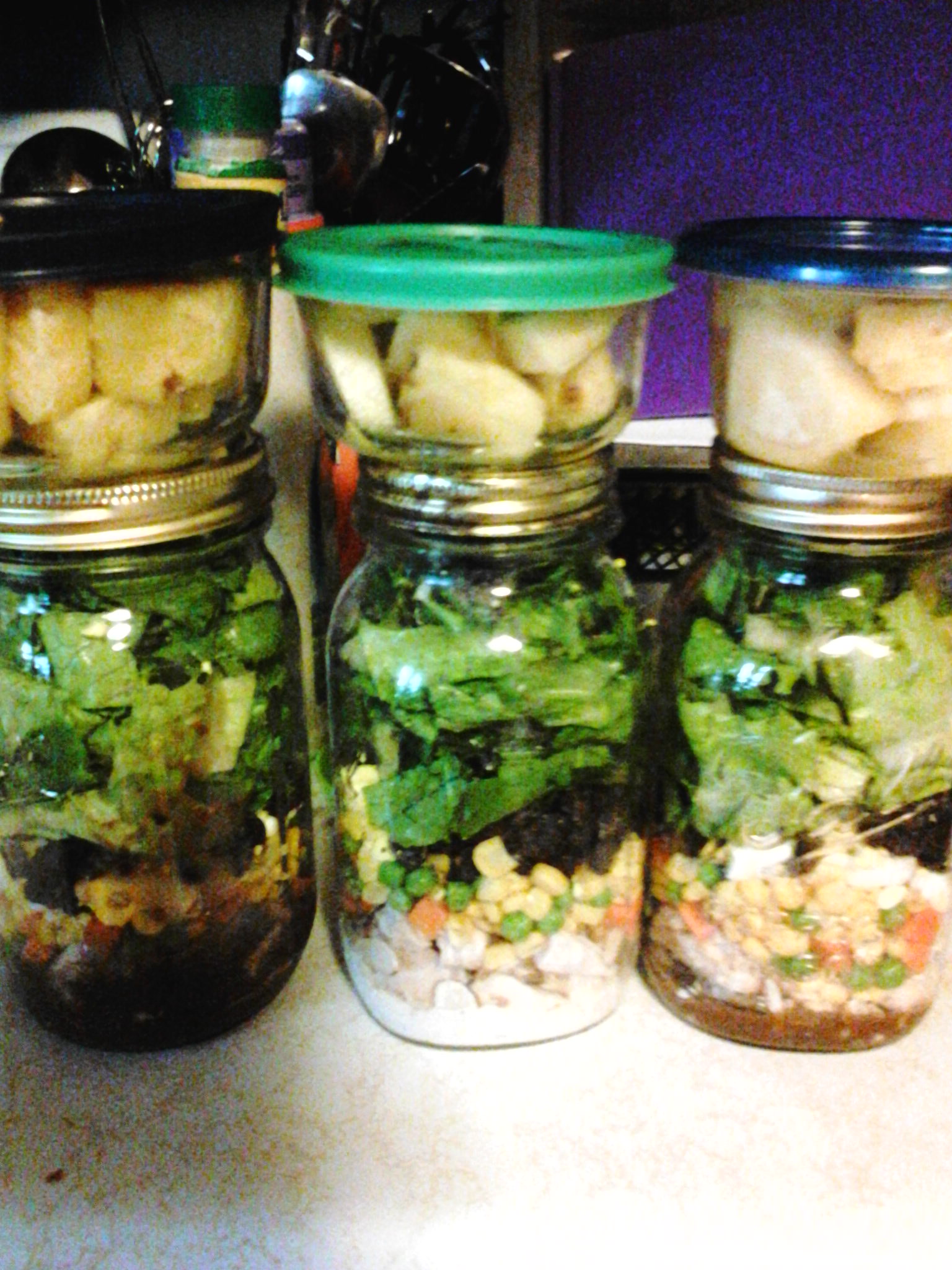 I have been making salads in a jar for lunches and it’s been a big win! I start with my dressing, then protein of chicken & shaved almonds. Then add some Chia seeds, carrots, peas and corn (from the frozen food section!), top it off with some peppers and lettuce. YUM! I was able to make these on Sunday night and because of the layering it stayed nice and fresh. Plus, they are very pretty which makes me happy mid-day!