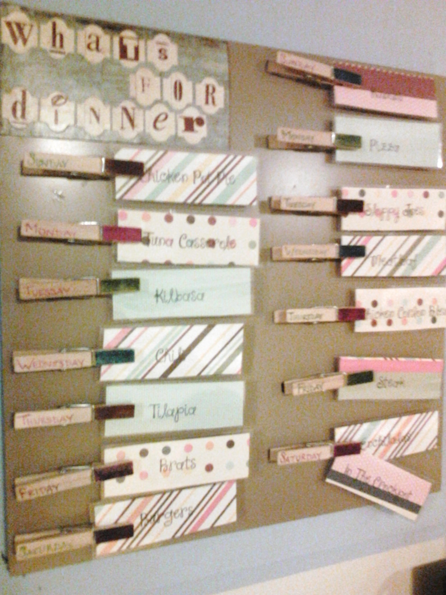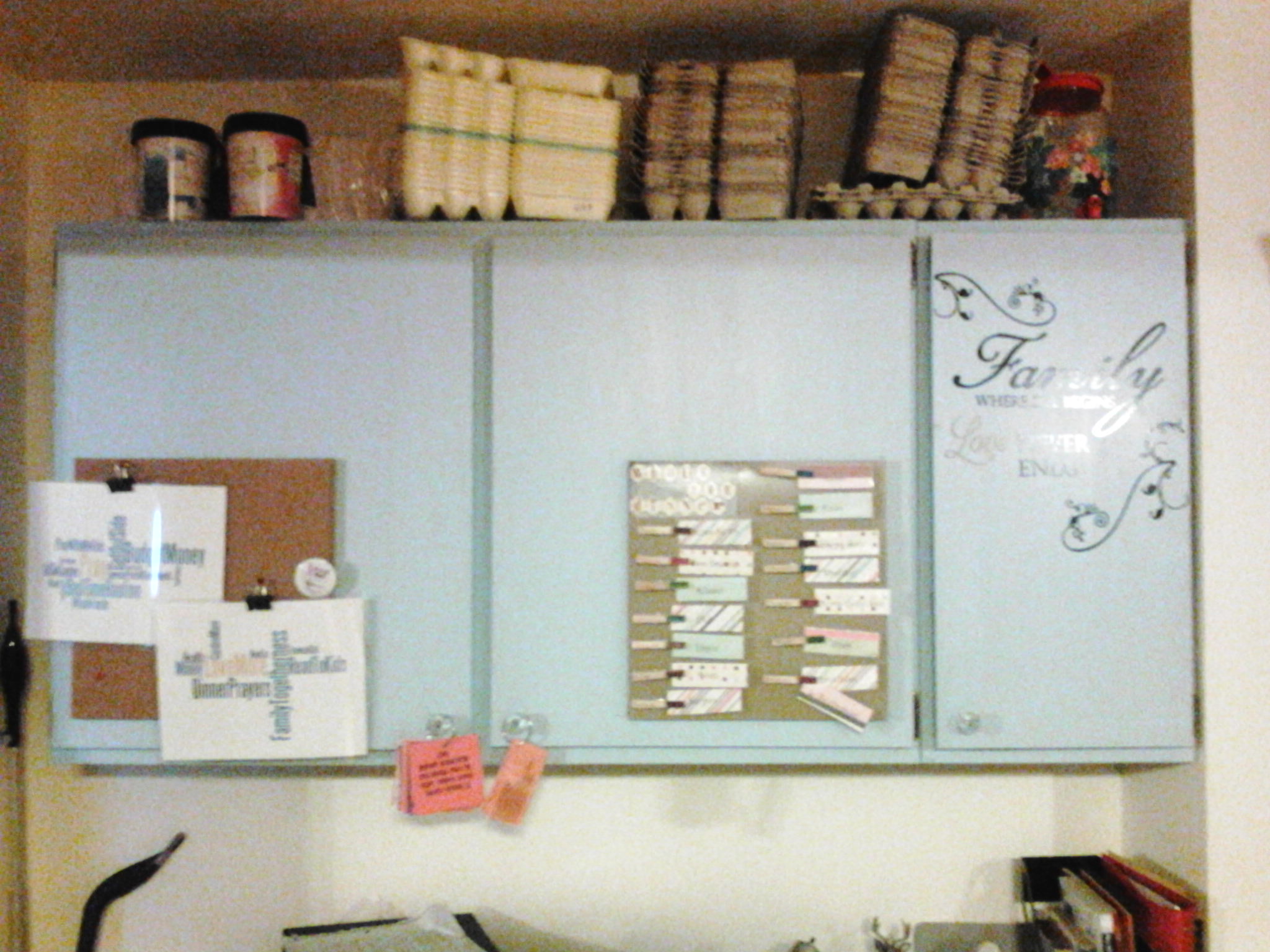 First is the outside. One cabinet has a corkboard that my husband and I keep our New Year’s Resolutions. Read about that HERE! On the opposite door is a magnet board that we keep our menu on. It was a calendar that I wasn’t using any more. I spray painted it a complimentary color, added a modge podged magnet that says “What’s For Dinner?” and clothes pins with magnets on the back. I have a bin full of laminated meals that our some of our families favorites. There are also blank card for when we come up with new ideas. We play our meals two weeks at a time for budgeting reasons. The nice this about this board is that when I’m running late and it’s my husband’s turn to cook, he can just pick a meal and rearrange, knowing that we have all the groceries needed for that meal in the house! On the handles of the door are sets of cards with fun table prayers and conversation starters. These are great for company or just went you need a little pick-me-up! On the third door is a saying “Family, Where Life Begins, Love Never Ends.” I love it!