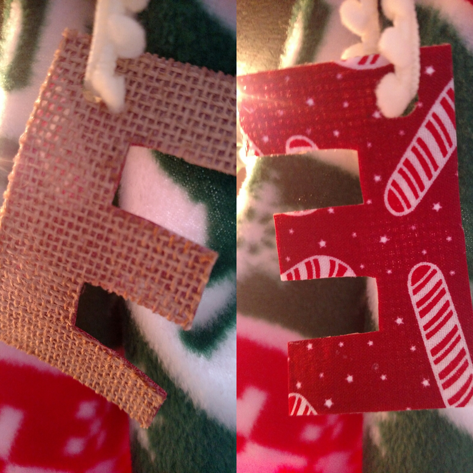 Last year I wrote about the fleece stockings I made for my family. This year I had to make another one. Last year I had three fabrics that matched and one odd ball. Thus year I found fabric to match the odd ball, so the three became the kids stockings and the two became the parents! It worked out perfect. I had also been on a mission to find a way to identify each stocking. I wish I had a sewing machine that could have done the embroidery, but I don’t. The fleece fabric limited what I wanted to put on it, such as puffy paint or iron on. Then I found these burlap letters at Walmart. I knew I was on to something! I wanted then reinforced, so I used tacky glue and glued them to some holiday fabric.