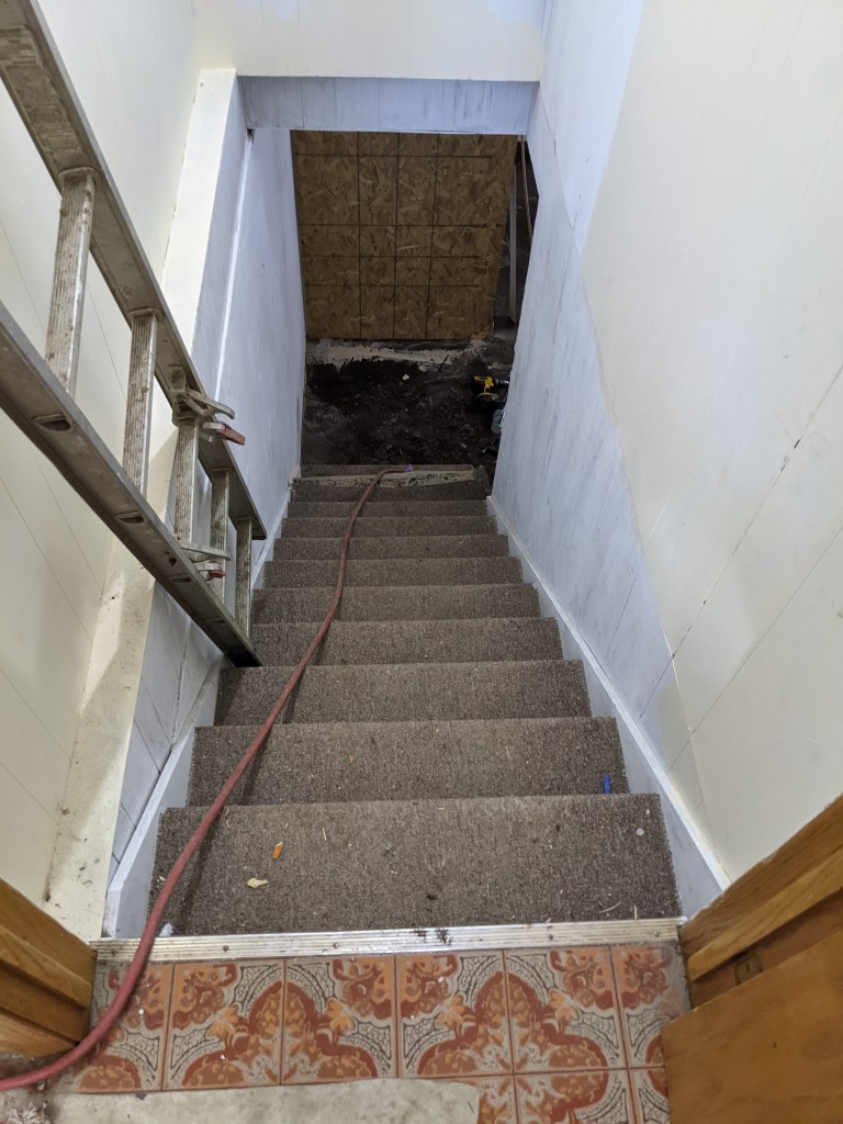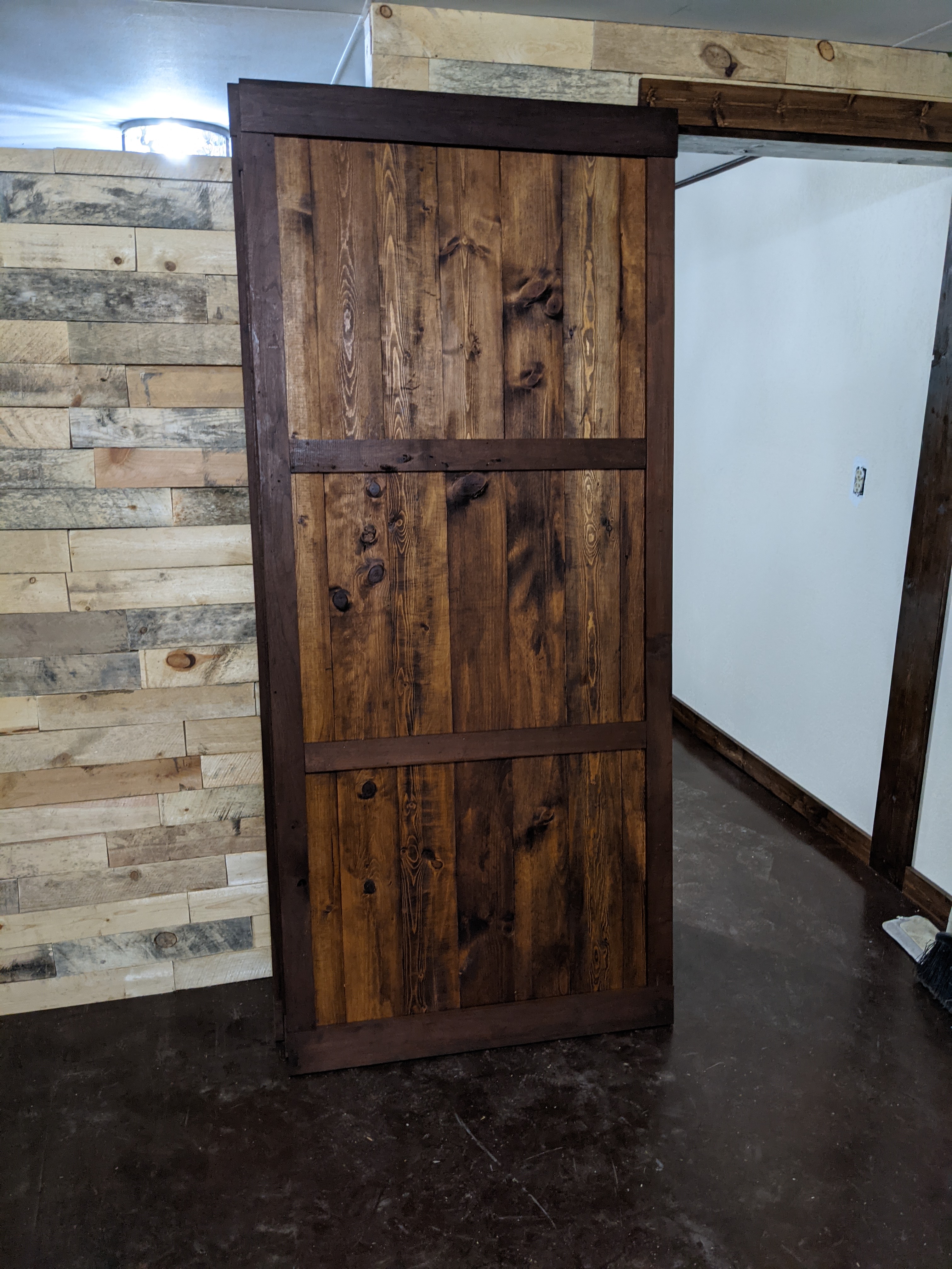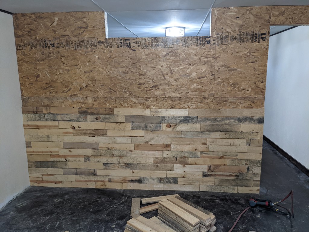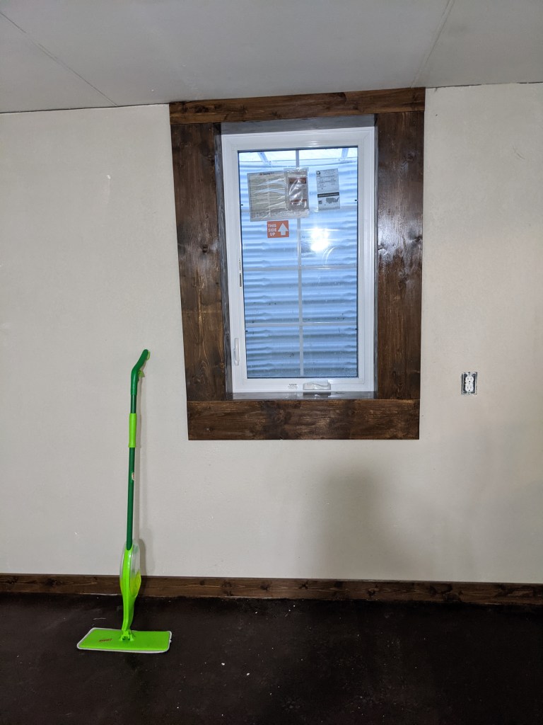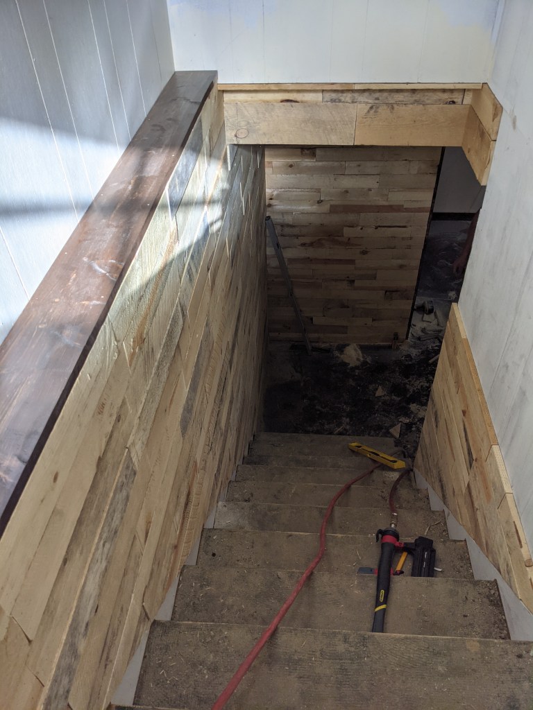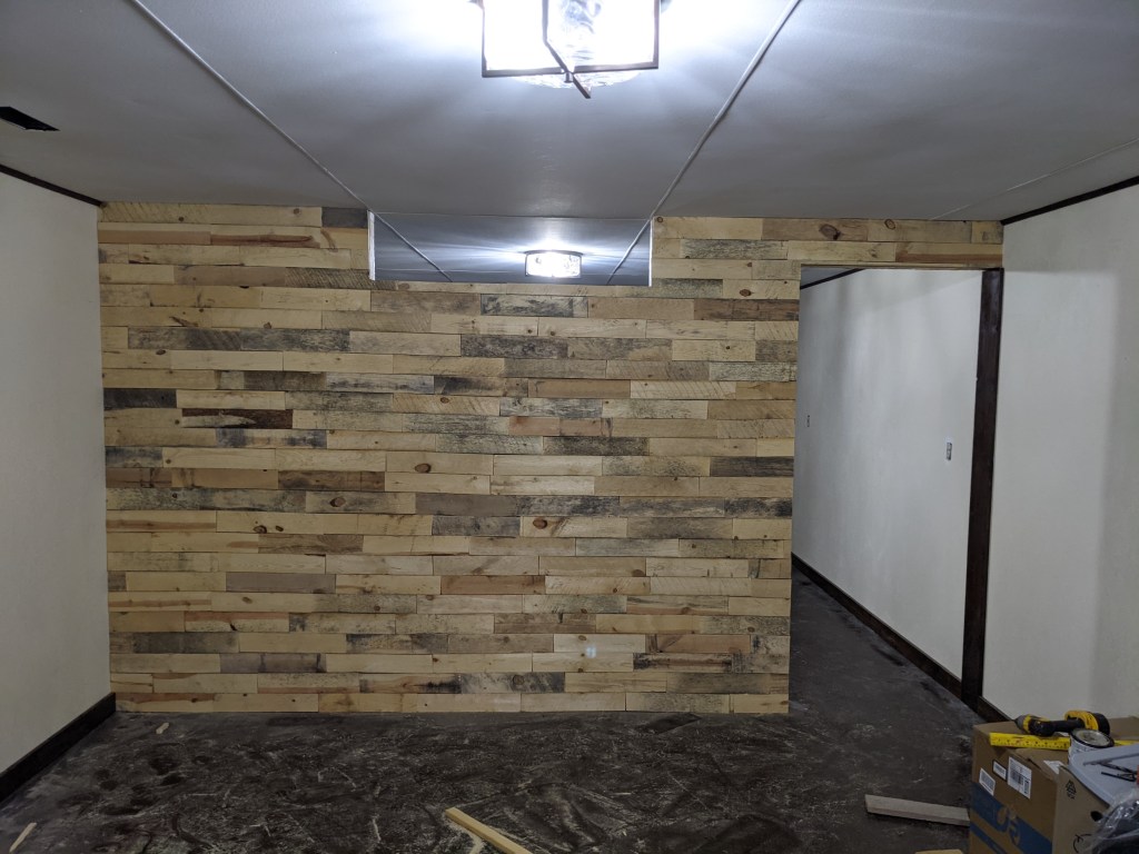 We gutted the bathroom, tore out walls, put in new drywall and fixed the other walls. Ross put in an egress window and a wall to separate the large room that ran the length of the house. We stained the cement floor. Ross used pallet boards to create awesome accent walls in the stairwell and on the new wall. It turned out exactly how I had envisions.