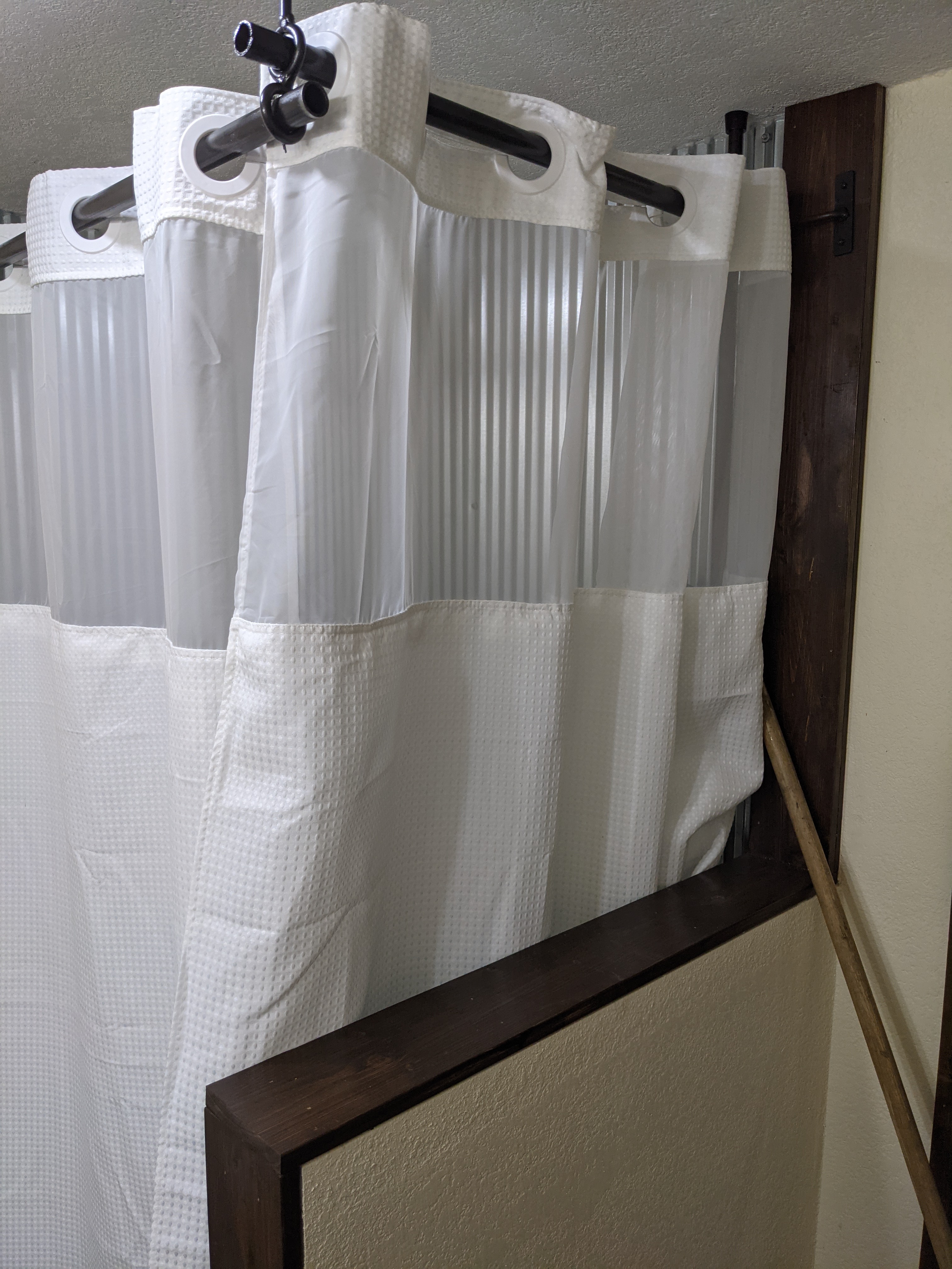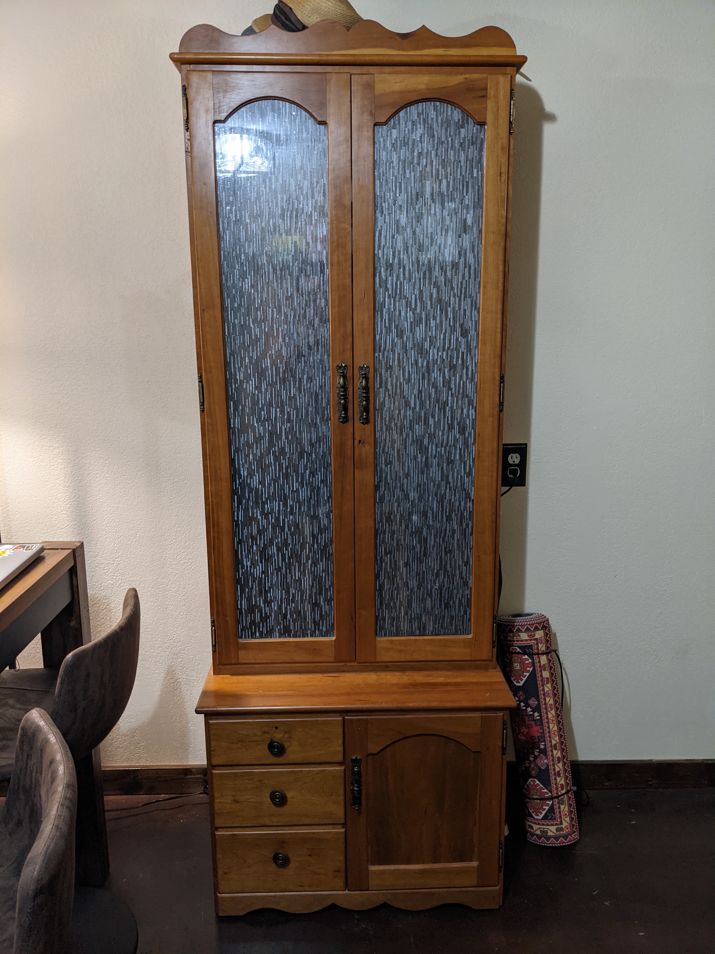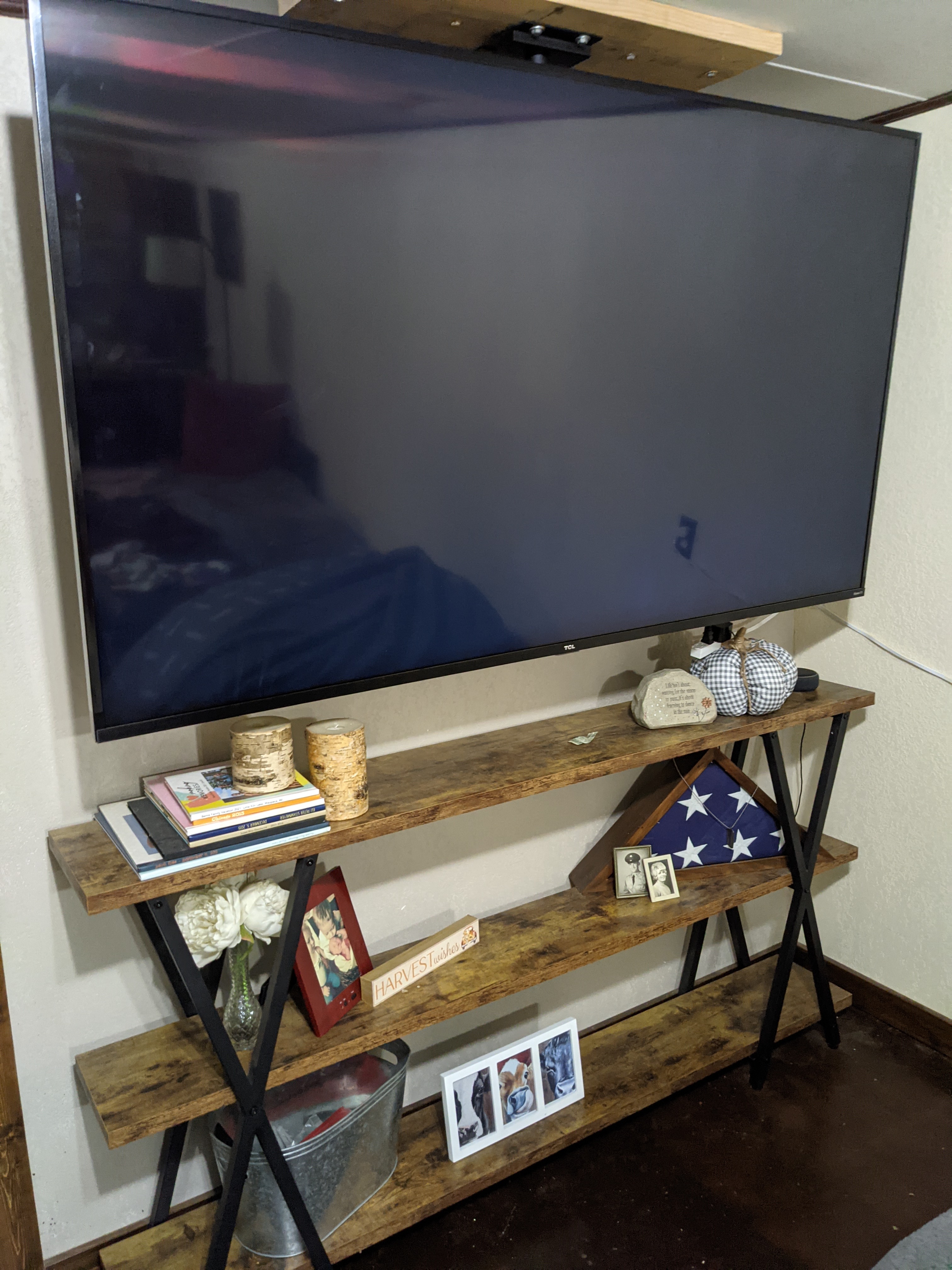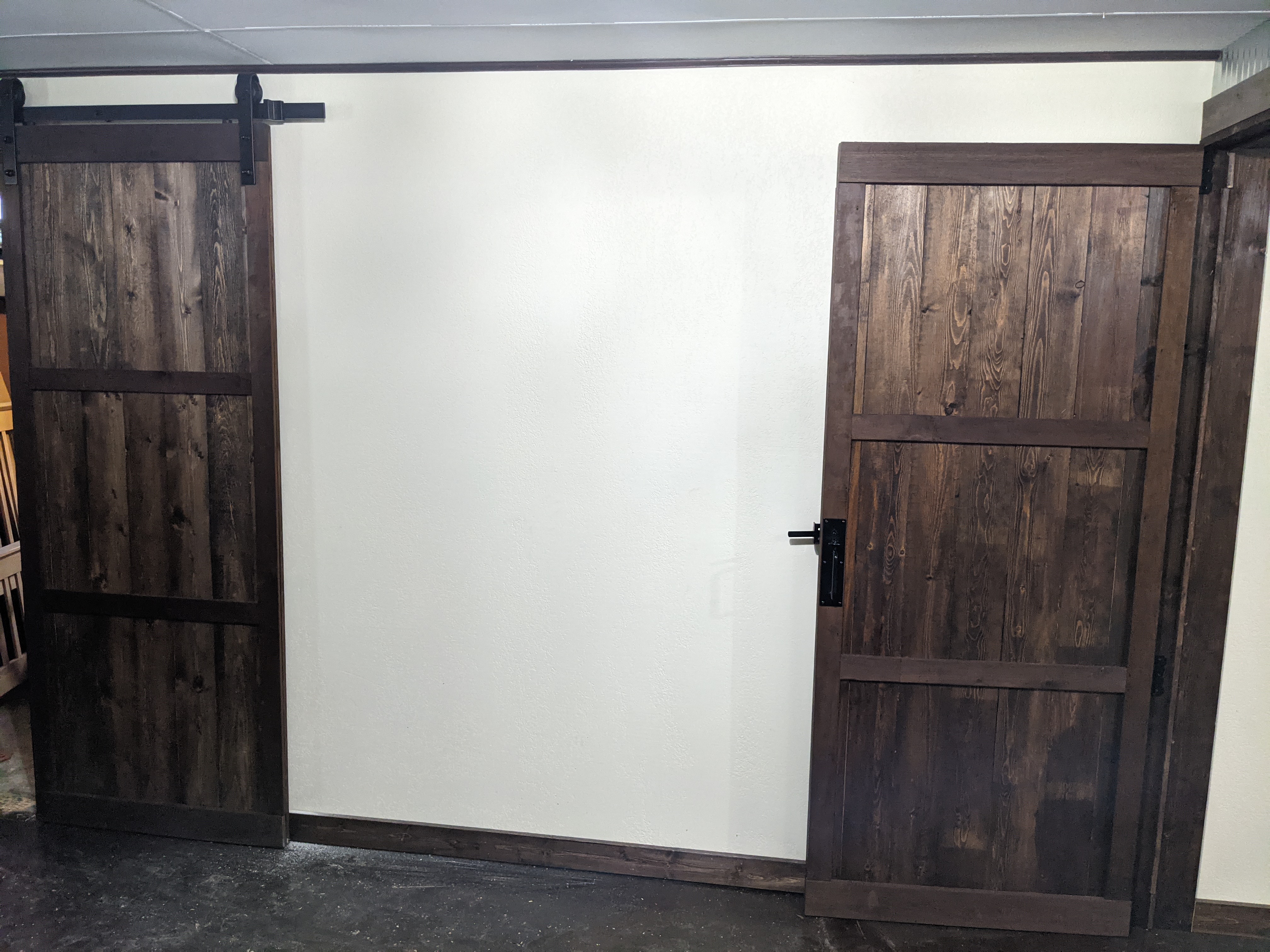 One of my favorite features are the four doors Ross made. Two are sliding barn doors that lead to our closet and storage/laundry room. The other two are to the bedroom and bathroom. They are gorgeous. I decorated the room adding special family pieces including my grandmother’s secretary and the gun cabinet from Ross’s family. We added a long bar table with three stools, a couch for snuggles and a giant beanbag that opens up to a king sized bed. Ross insisted on a LARGE TV and he got no argument from me!
