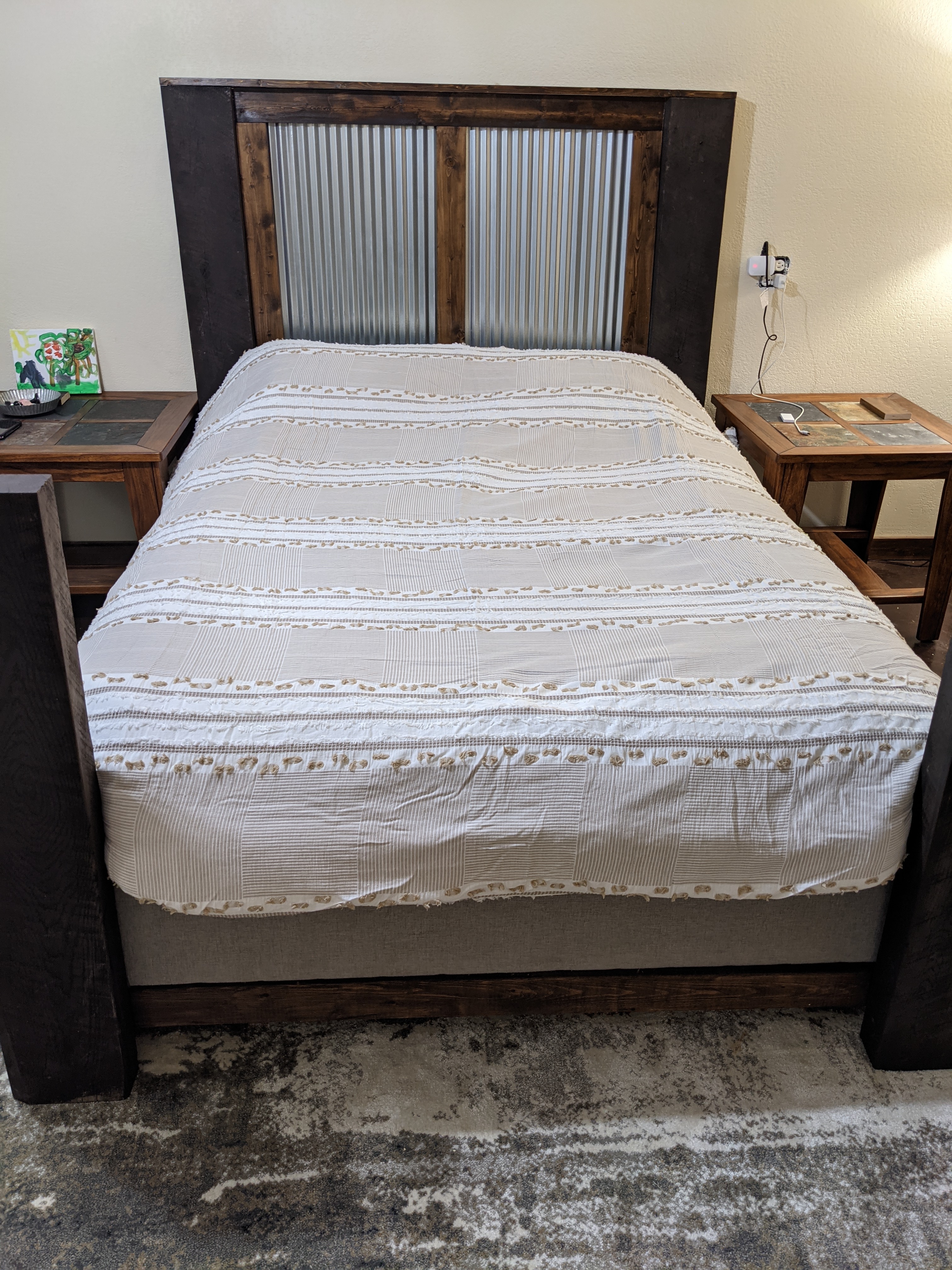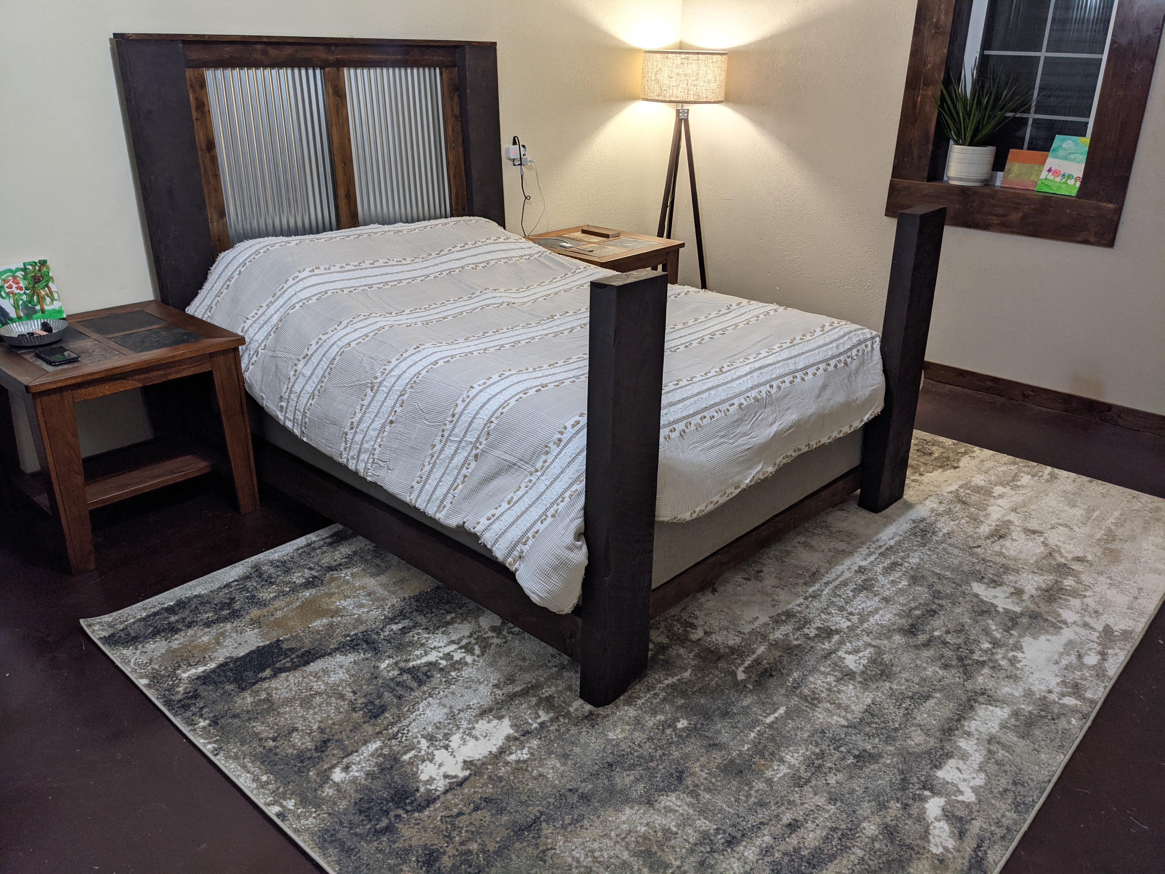 Ross also built our beautiful bed. This room is my sanctuary. It’s a place for rest, for love, for recovery, for decompressing. It’s beautiful. Our bedside tables were purchased by Ross’s mom just before her passing, she never got to see them. They had been in the box since that time. After his dad’s passing, Ross brought them home to see if they might work. They are the perfect addition to this truly special space.
